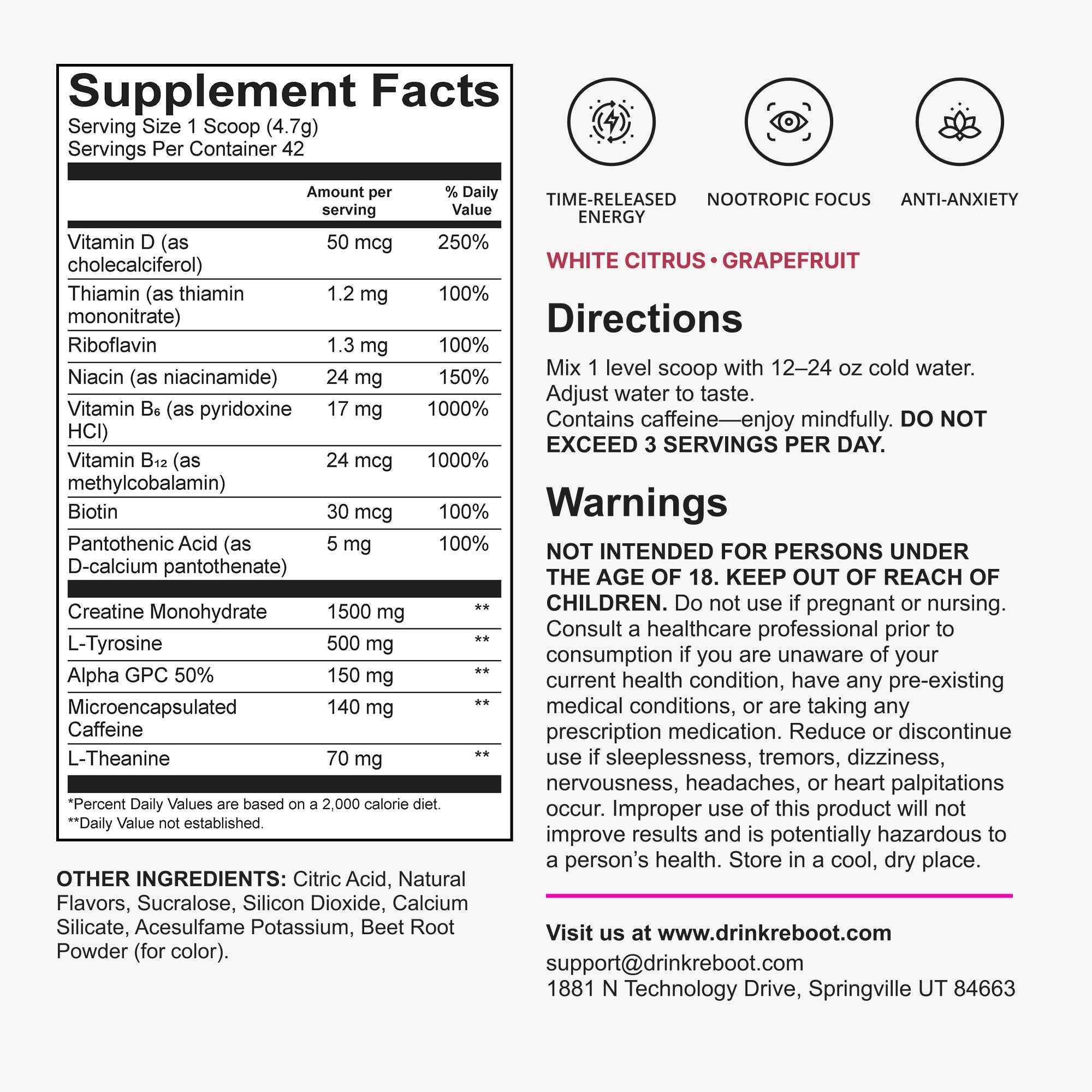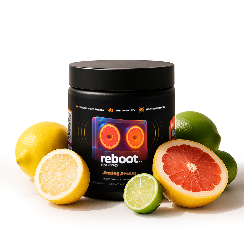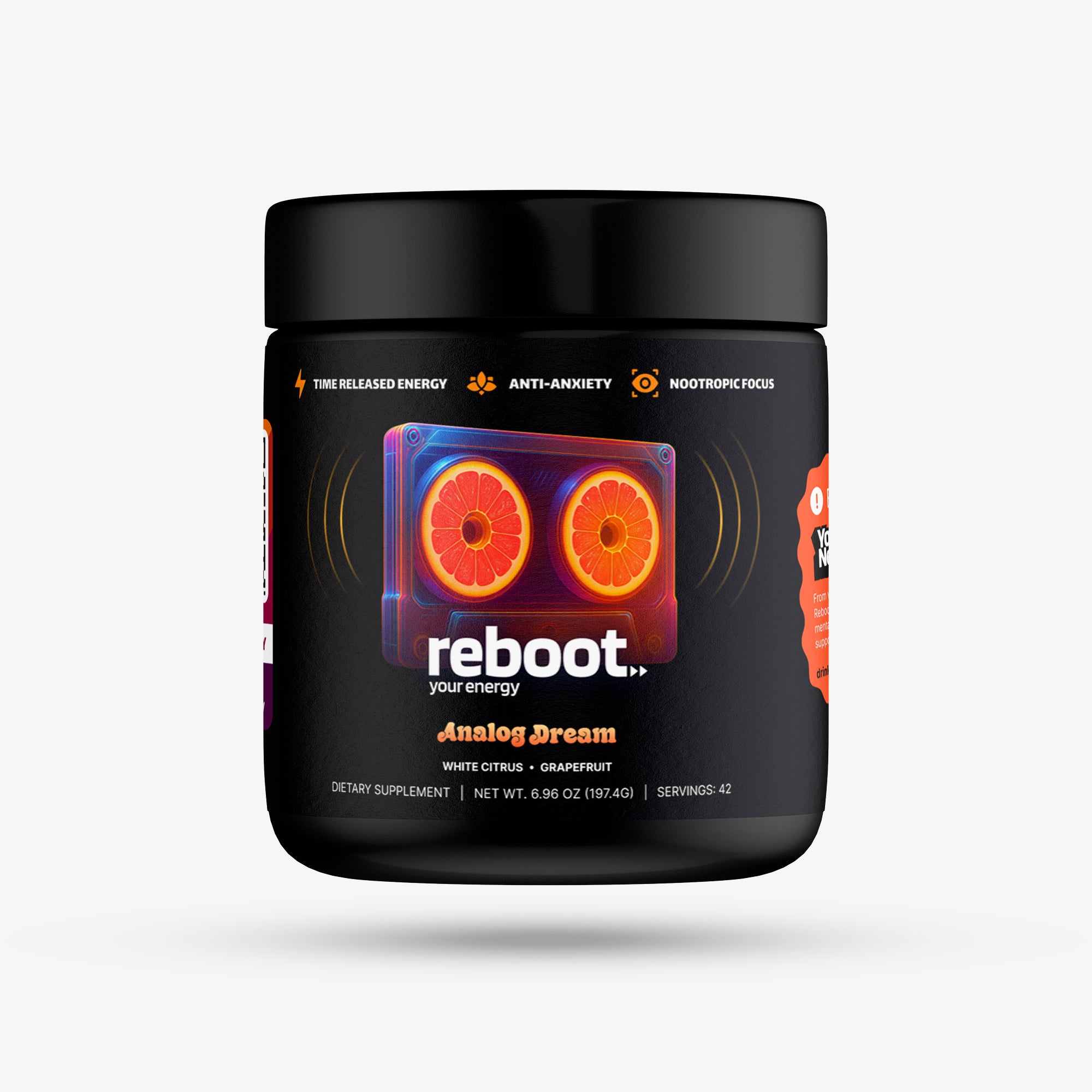 Reboot flips the formula with clean, nootropic-powered energy that fuels focus, steadies caffeine release, and keeps you locked in—no jitters, no burnout, just balanced performance.