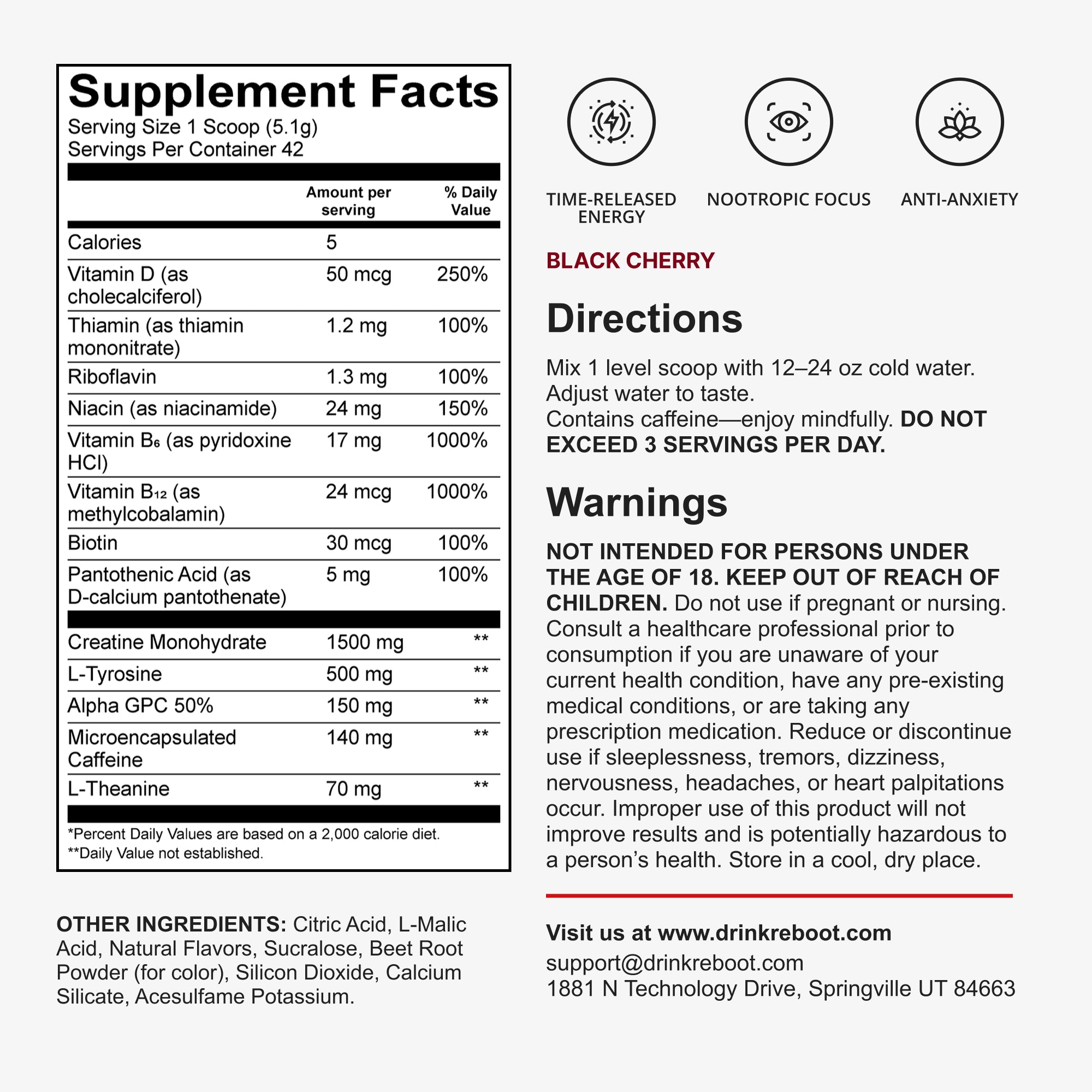 Microencapsulated Caffeine • Alpha-GPC 50% • L-Tyrosine • L-Theanine • Creatine Monohydrate • Vitamin B6 • Vitamin B12 • Vitamin D3 • Natural Flavors • Citric Acid • Sucralose • Fruit and Vegetable Extracts for Color.