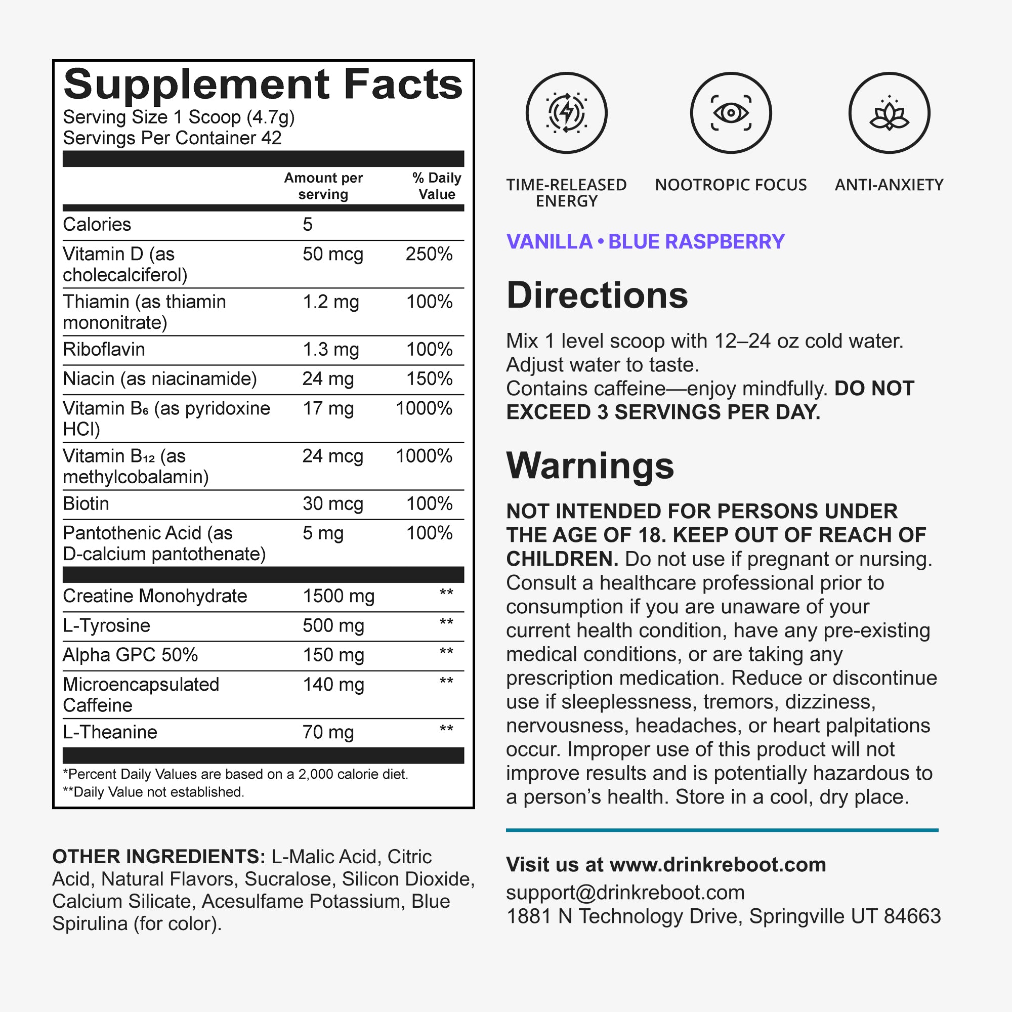 Reboot flips the formula with clean, nootropic-powered energy that fuels focus, steadies caffeine release, and keeps you locked in—no jitters, no burnout, just balanced performance.