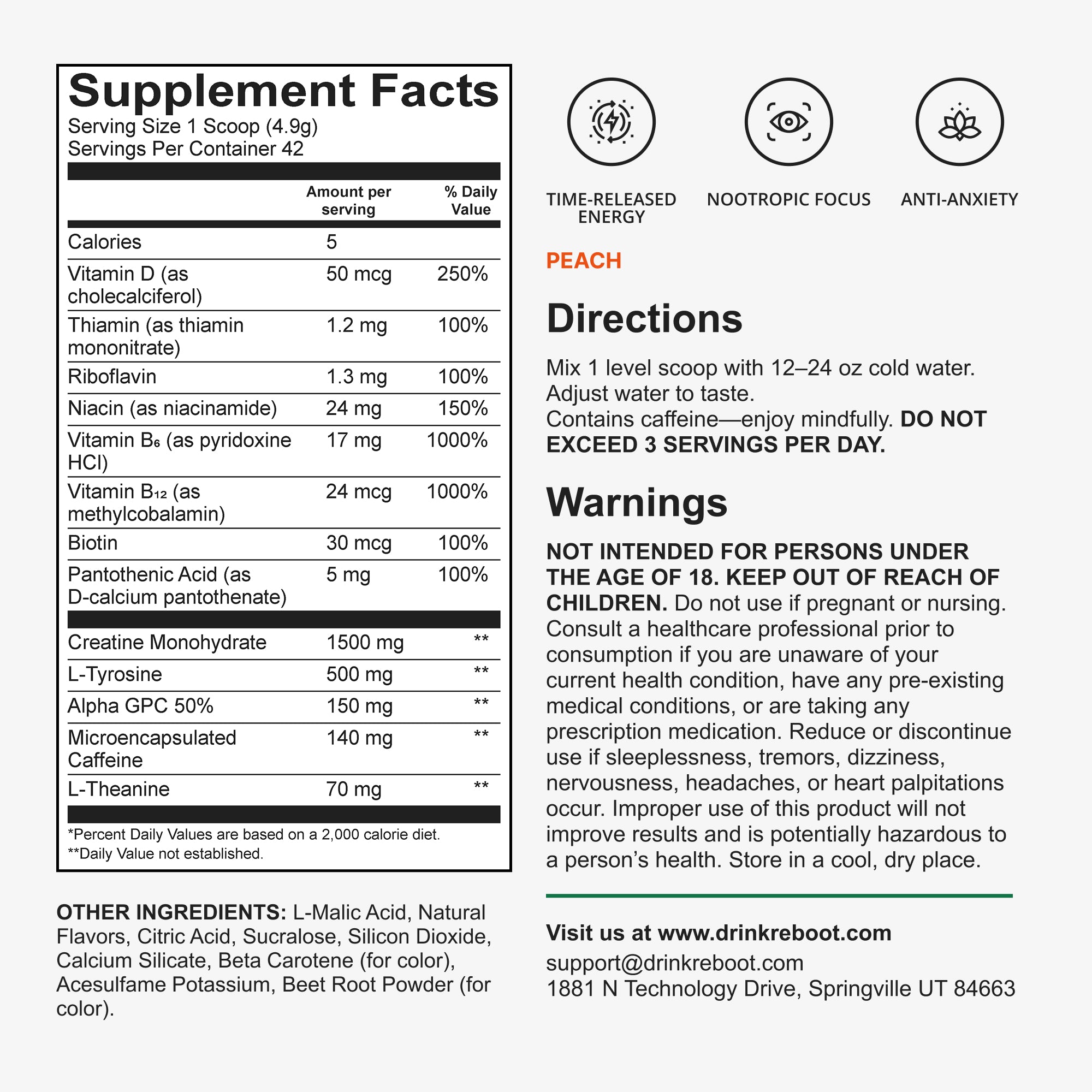 Every serving of Reboot has 140mg of microencapsulated caffeine for smooth, steady energy—no spikes, no crash. Alpha-GPC and L-Tyrosine sharpen focus, while L-Theanine keeps you calm and clear. Creatine fuels mind and muscle, with B6, B12, and D3 for natural metabolic energy.
